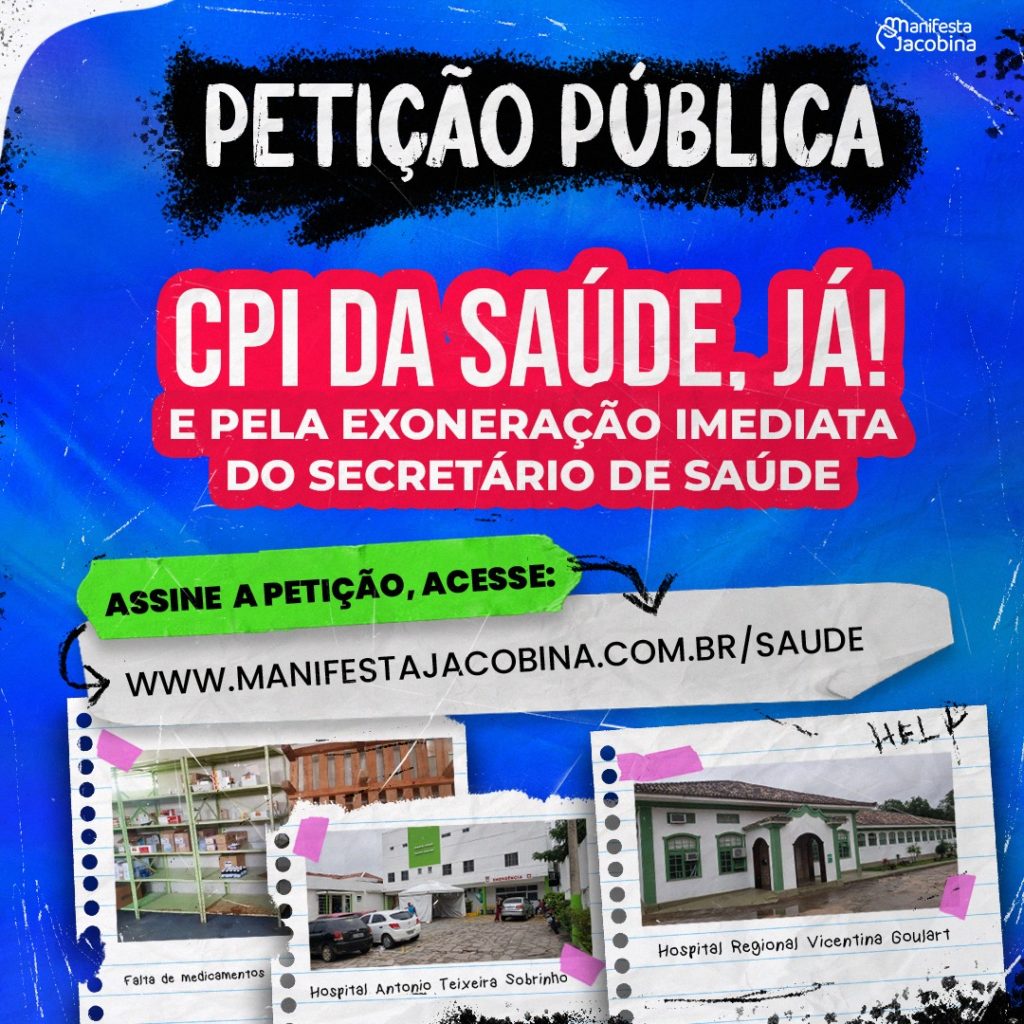 Além de assinar a petição pública exigindo instauração de uma CPI pela Saúde em Jacobina, você também pode contribuir de outra forma importante: baixe o card e compartilhe junto com o link ManifestaJacobina.com.br/Saude com seus amigos e familiares nas redes sociais, grupos de WhatsApp e outras plataformas. Quanto mais pessoas souberem sobre essa luta em defesa da saúde pública de qualidade, mais apoio teremos e maior será nossa capacidade de pressionar por mudanças concretas.